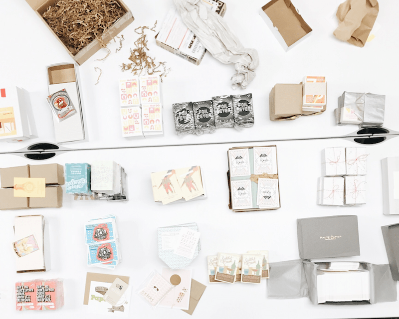 Good Juju Ink copyI love the uneven plaid created by the neon pink and yellow lines of this design from Haute Papier. Parse & Parcel’s Jill loved how it arrived at her studio — I’m so glad she captured the cards’ packaging.Haute Papier copyHester & Cook’s screen-printed study in minimalism was one of three designs they submitted. We had a hard time picking this one, as they were all divine!Hester and Cook copyFirst-time exhibitor ilootpaperie profiled Pierre, its namesake bandit — who has stolen millions of hearts with his expert lightfooted wordplay — on its mirrored design. I loot Paperie copyJust in time for summer, this cool design from first-time exhibitor Inklings Paperie — whose booth was mobbed each time I strolled by — has its booth number blind printed at the bottom, a clever touch from a brilliant range!Inklings 2 copyI find Mudsplash Studios’ suspender-wearing, roller-skating pig irresistible. On the front of the card (where he is depicted in sunglasses), his face is a series of dots, evoking true ’70s comic book style.Mudsplash studios copyPaperFreckles contributed this jive turkey design — love the lettering and sassy stripes on front!Paper Freckles copyPaula & Waffle used a great airmail-inspired border for its sweet card. Loved the watermelon paper in which it arrived!Paula and Waffle copyScotch & Cream’s is a liquor cabinet supreme — so cool! And right in keeping with the vibe of this swinging line.Scotch and Cream copySmarty Pants Paper Co. used ultra-colorful risograph printing for its Southern-kissed “Tease it to Jesus” design. Smarty Pants Paper copyAnd Steam Whistle Letterpress contributed this handy letterpress infographic — making me nostalgic for the filmstrips of my school years. I can almost here the “beep” which prompted teachers to go to the next slide.Steam Whitsle Letterpress copyEveryone sent their designs to Parse & Parcel’s office, where they were painstakingly arranged in piles by staffers in early May. I paid a visit that day, and it was fascinating to see everything start to come together! Meanwhile Jill is posting her take on the project on Parse & Parcel blog today — don’t miss it!